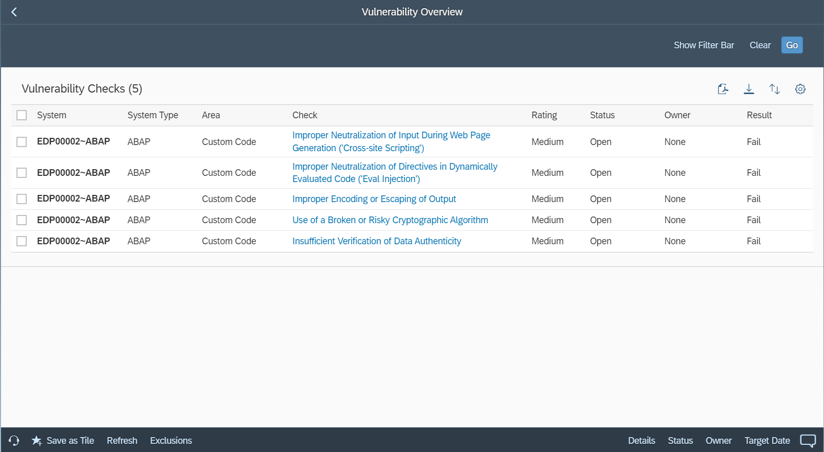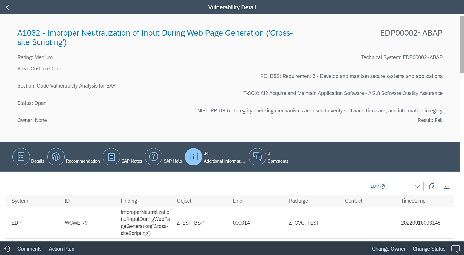 CES provides detailed information for vulnerabilities detected in custom SAPUI5 applications, including risk analysis, remediation guidance, and details of the impacted lines of code, objects, packages and owners. Findings are also mapped to the Common Weakness Enumeration (CWE) framework to monitor for compliance against coding best practices. CWE is software development standard supported by US-CERT and the National Cyber Security Division of the U.S. Department of Homeland Security. The results of static code scan results for custom SAPUI5 applications can be reviewed and managed using SAP Code Inspector (SCI) and exported as Excel/ PDF reports. The results are also integrated with the Vulnerability Report in CES, accessed from the Fiori launchpad for SAP Solution Manager.