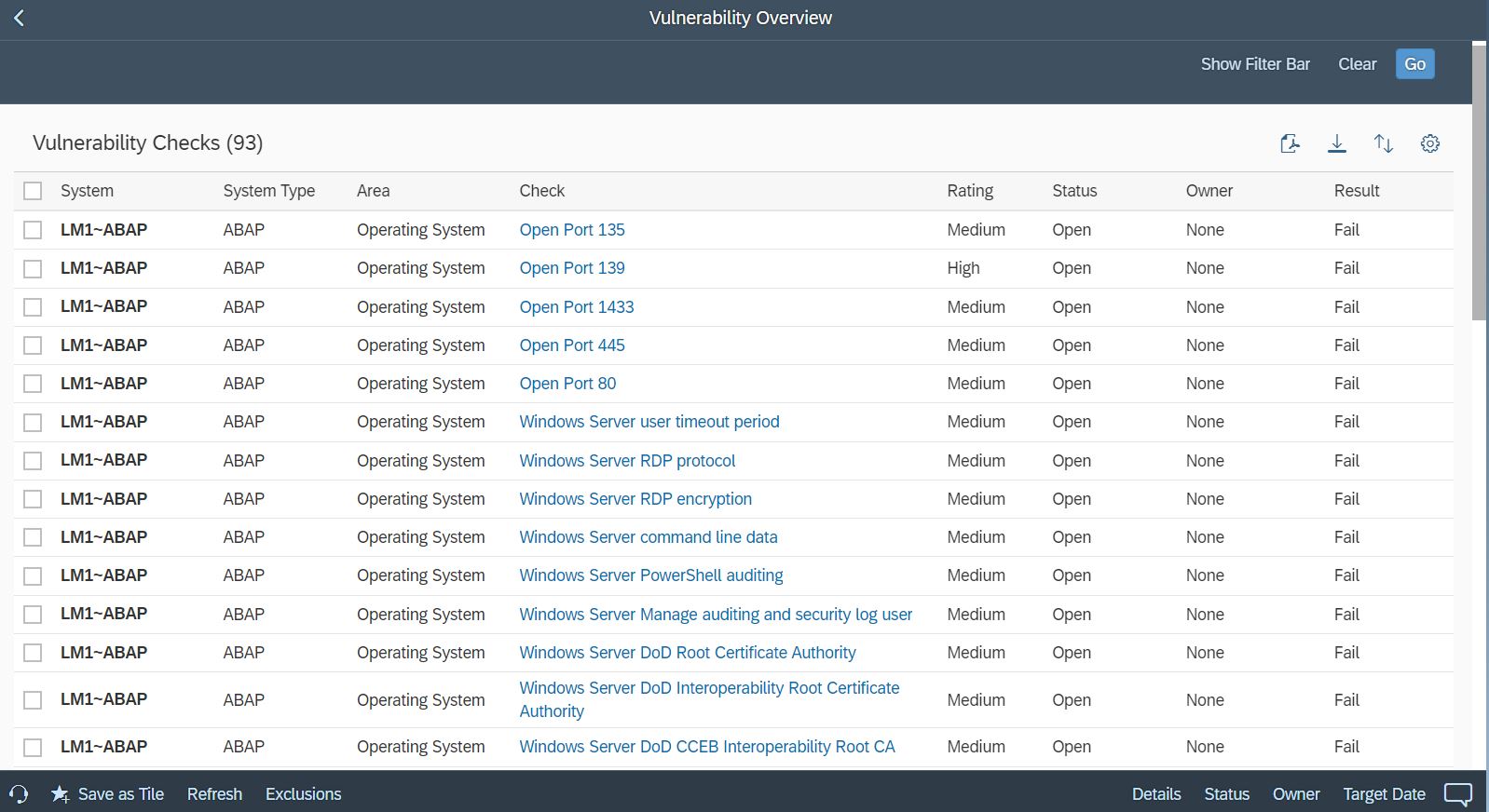 Together with over 2000 vulnerability checks for SAP solutions, the Cybersecurity Extension for SAP performs automated vulnerability scans for Microsoft SQL Server and Microsoft Server to detect more than 300 known security weaknesses in the platforms. This includes active vulnerable services that widen the attack surface for databases and hosts, authentication settings including password policies, file and table encryption, users with administrative privileges including system and user administration, the availability of standard users, logging and auditing, open ports and services, and host firewall settings.