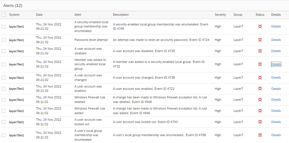 The Cybersecurity Extension for SAP also monitors database and operating logs to detect indicators of compromise in Microsoft platforms and trigger alerts and email/ SMS notifications for security incidents. This includes system, role and user changes, direct access to user tables, changes to database schemas, user groups, scheduled tasks, stored procedures, passwords and firewall settings, failed logons including attempted remote logons, packets blocked by host firewalls, remote procedure calls, service activation, device and program installation, and changes to system auditing.